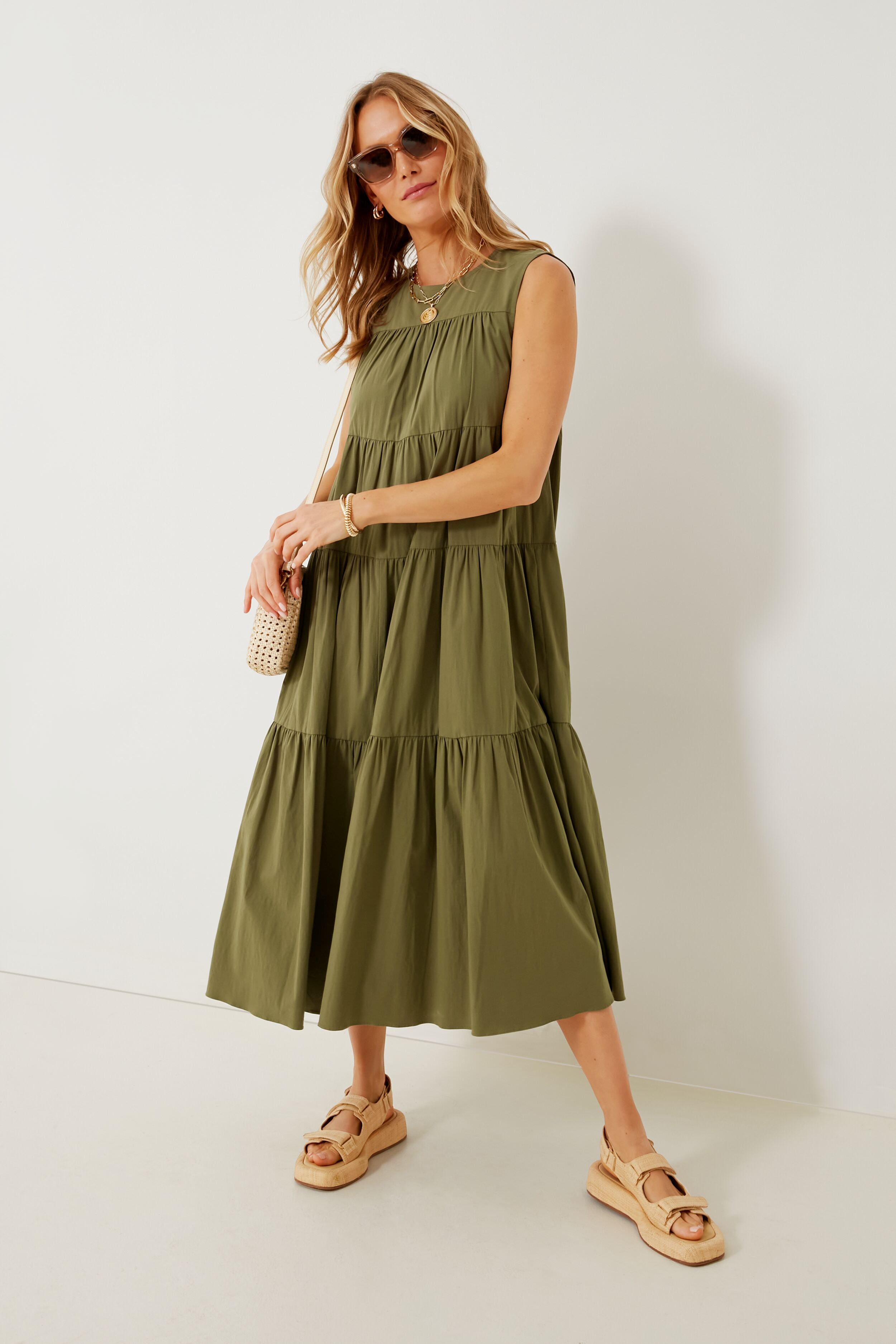 Polished and lightweight. we will be living in the Carmen Dress all summer long. In an army green hue that's easy to wear. this floaty style features a tiered body and the perfect maxi length to show off your favorite shoes. The definition of throw-on-and-go. just add sunnies and gold accessories for everything from summer camp drop-offs to spontaneous happy hours!