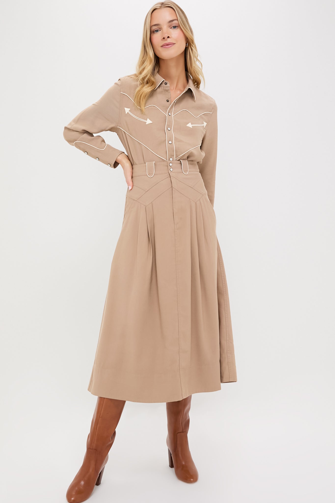 The Field Skirt is a wear-everywhere staple. It's fitted at the waist and flows into a sweeping skirt that hits at the low calf. Complete with western-shaped yoke details and a subtle contrasting buttons. evoking the vintage look we love. Wear yours with a matching Barley Western Shirt and boots for your next adventure.