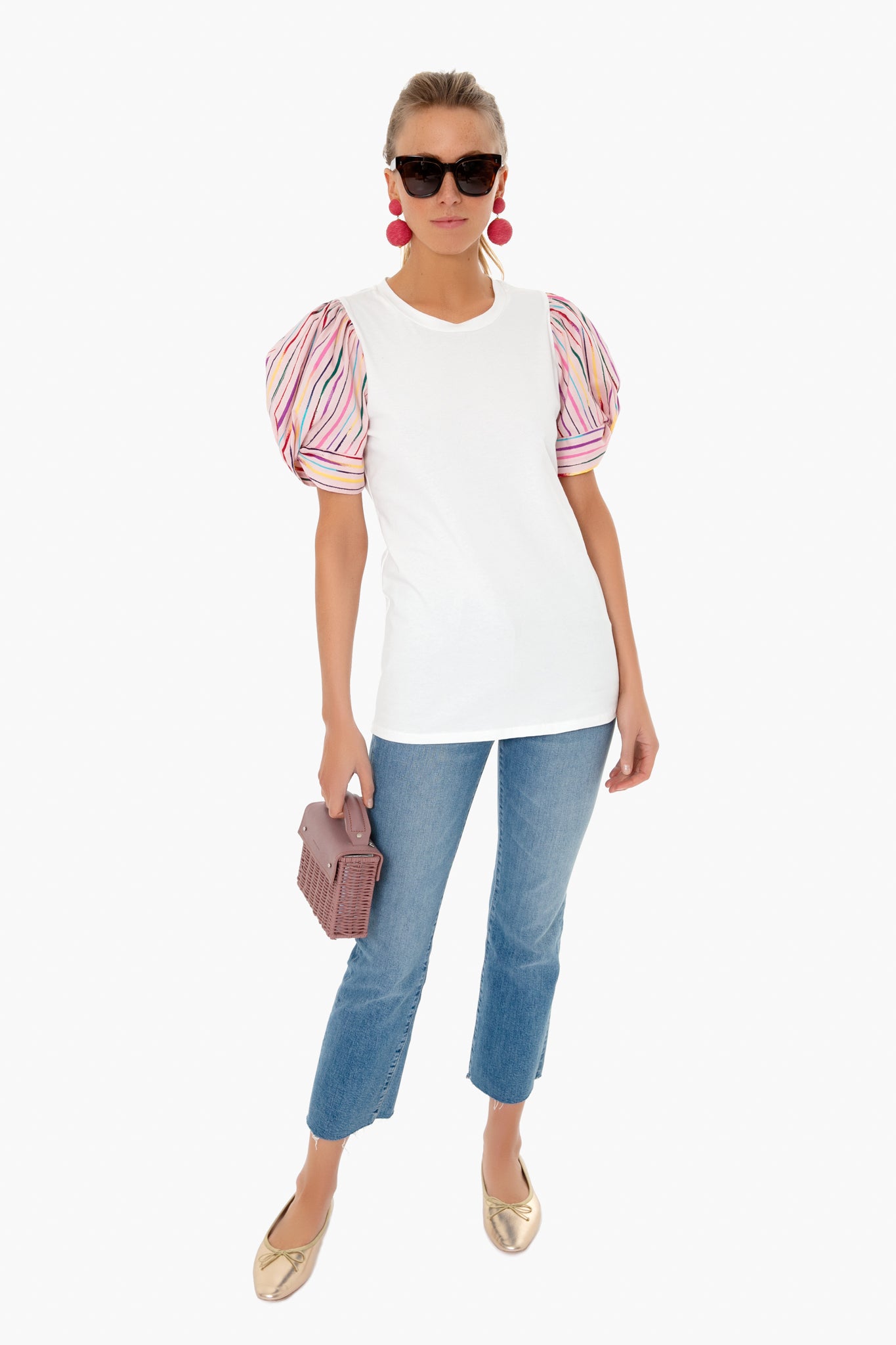 The Bermuda Pink Sorbet Printed Sleeve Top is a fun update on the basic white tee. With a knotted. puffed short sleeve in a colorful sorbet stripe. this style is a must-have for the season ahead. Pair with denim and statement earrings for a sunny afternoon stroll at the market!