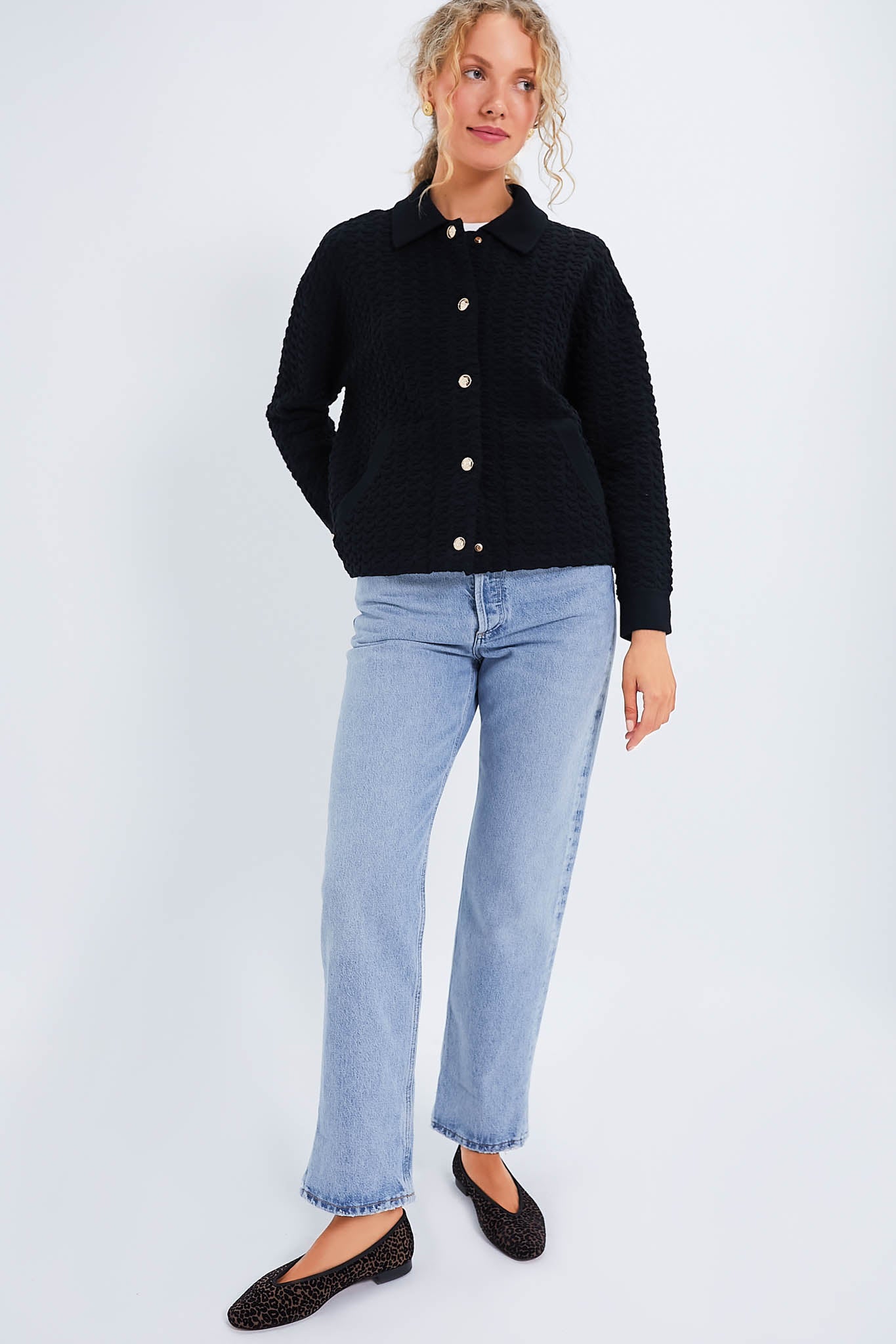 This elevated look is made from a soft wool in an embossed jacquard texture. It has a straight silhouette with gold front snap buttons. making it perfect for wearing closed or open. We are styling it over and LBD with black flats for a Parisian-chic look. or with denim and boots for a casual-cool ensemble.