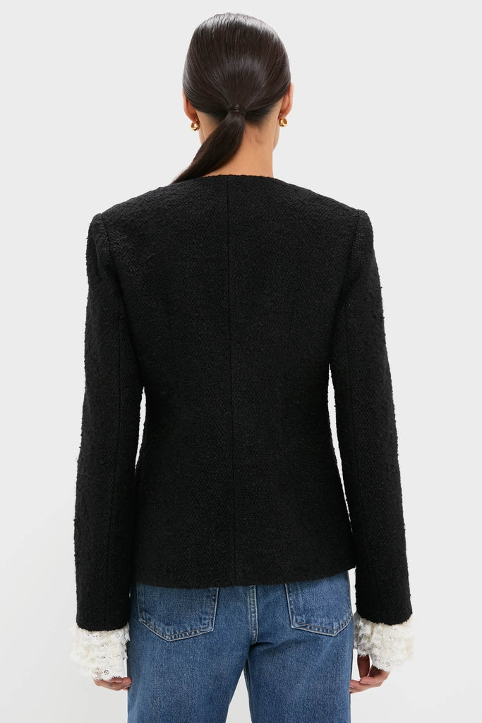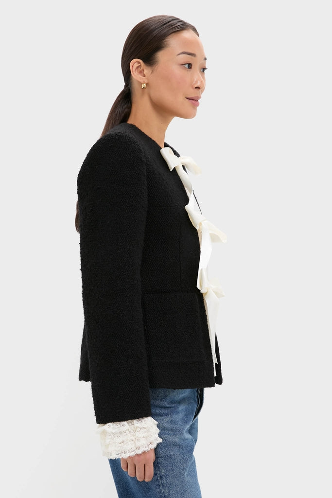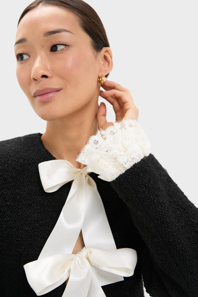 The Seraphine bow jacket is tailored from richly textured bouclé. accented with oversized satin bows and finished with detachable lace cuffs for a versatile. feminine touch. Pair with jeans or trousers for a tailored look.