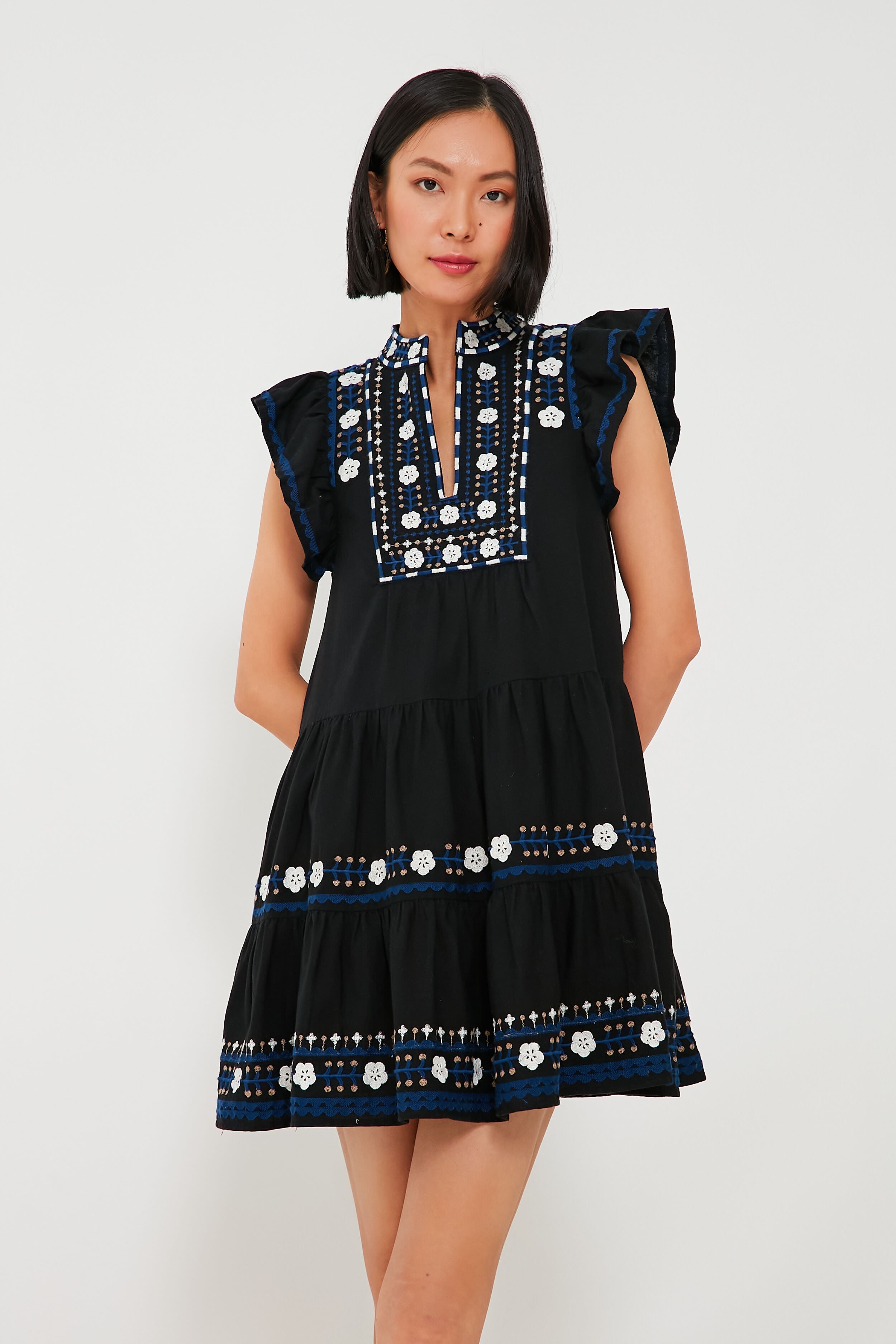 Designed for an easy-breezy and relaxed fit. the Black Shaina Dress is adorned with delicate floral embroidery that lends an elevated bohemian feel to this stellar mini. A band collar with a split neckline bring a little intrigue to the silhouette. while short flutter sleeves and a tiered skirt are just begging to be worn somewhere with a warm breeze. Made from a lightweight and super-comfortable cotton-linen blend you are sure to love. this is a perfect wear-anywhere look. Dress it up with espadrilles and gold jewelry for backyard parties or dress it down with sneakers and sunnies to run errands in style!