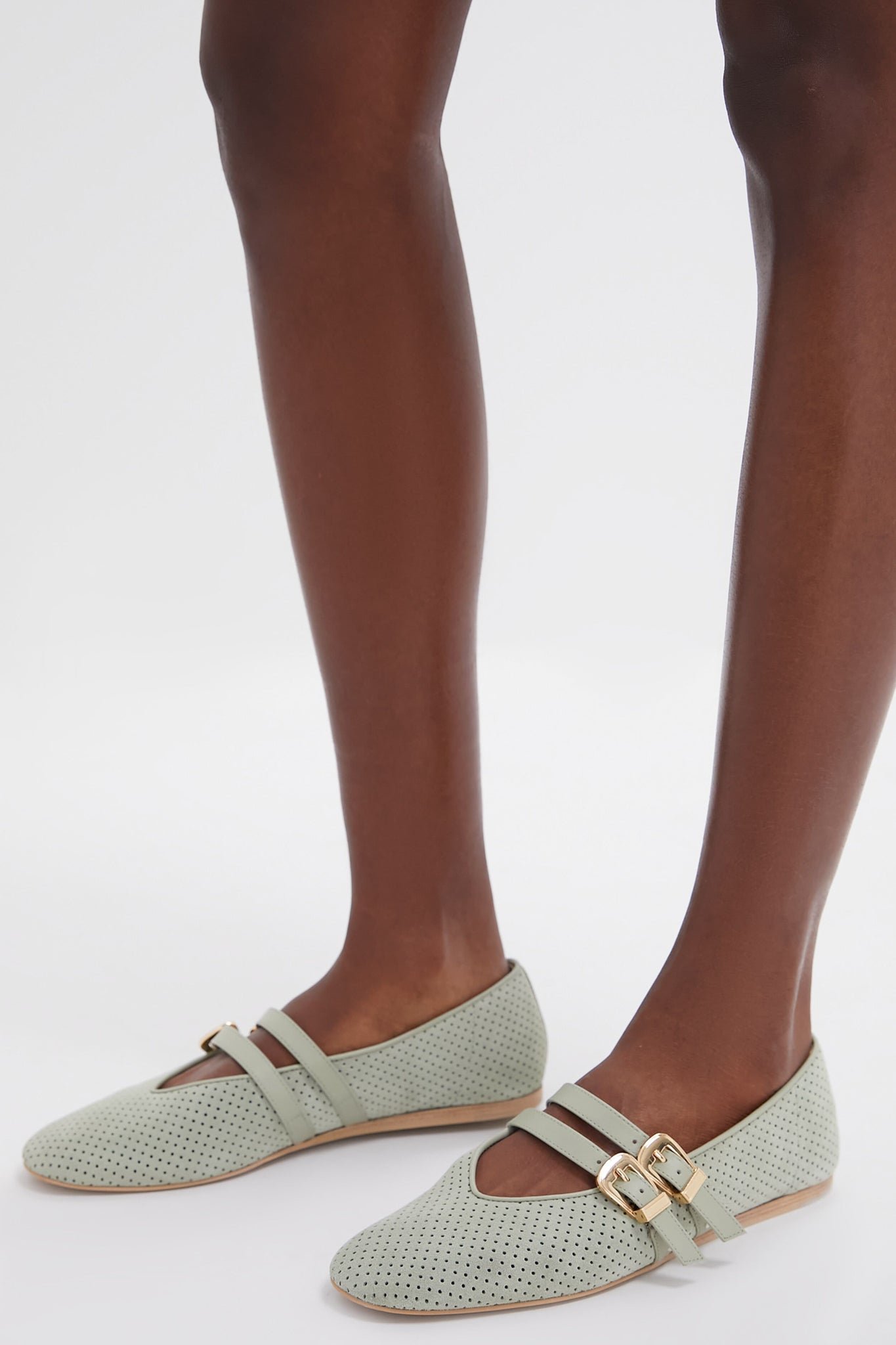 With a polished silhouette and a bold double buckle. the Jade Baylee Flat is romantic with a bit of edge. This dreamy flat boasts an airy perforated suede and neutral light green that will pair with just about anything in your closet!